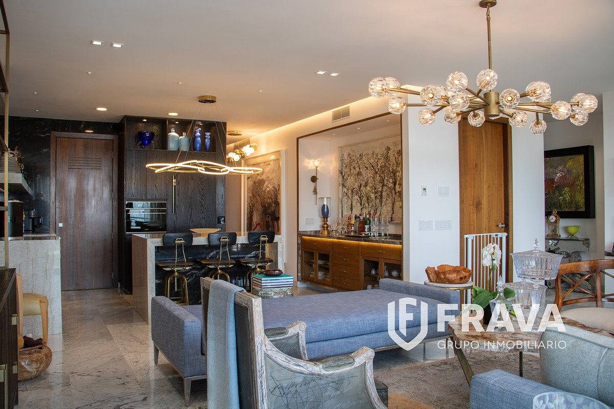 Apartamento ubicado en esquina de la torre en el piso 12, diseñado por un despacho profesional de interiorismo, con dos recamaras principales de gran tamaño, cada una con baño completo, ademas de medio baño para visitas. sala, comedor, cocina de diseño personalizado y cuarto de lavado con carpinteria de madera hecha a la medidad y terminados de marmol. amplio balcon con vista panoramica a la ciudad y skyline de andares. tres cajones de estacionamiento premium y una bodega.